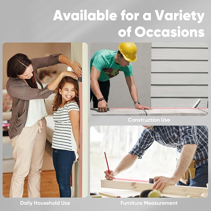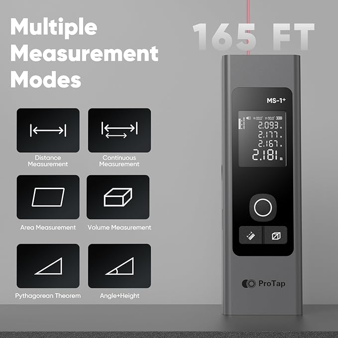 - 【High-Precision Laser Measuring Tool】 The ProTap 2-in-1 laser measure delivers professional-grade accuracy with a measuring range of 0.03-50m (0.1ft-165ft) and ±2mm precision. Its advanced laser technology ensures reliable performance for both indoor and outdoor applications, from small interior spaces to large construction projects. The tool provides accurate measurements for room dimensions, material calculations, and complex layout planning, meeting the demands of professional users.