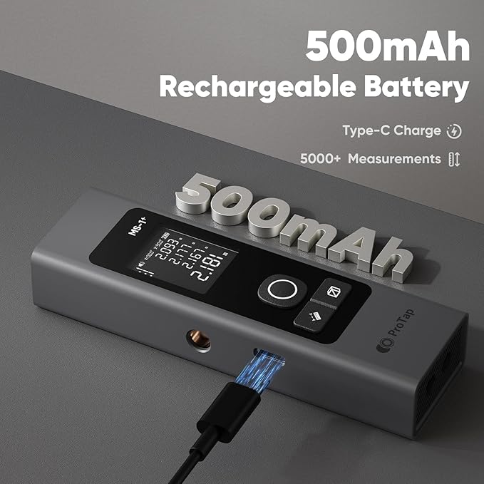- 【User-Friendly Design with Smart Features】 The ProTap laser measurement tool combines practicality with intelligent functionality, featuring a large 1.4-inch backlit LCD screen for optimal visibility in all lighting conditions. Its 500mAh battery capacity rechargeable provides extended operation time, while the auto-shutoff function activates after 180 seconds of inactivity to maximize battery efficiency.