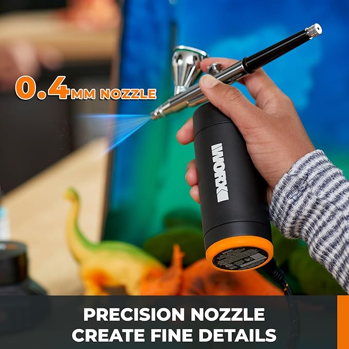 - DUAL-ACTION AIRBRUSH FOR EASY CONTROL: Equipped with 0.4mm precision nozzle, MAKERX Airbrush Gun also features a single trigger that controls both airflow and paint volume. The built-in compressor features adjustable pressure from 14-18 PSI, allowing you to customize airflow for a variety of applications.