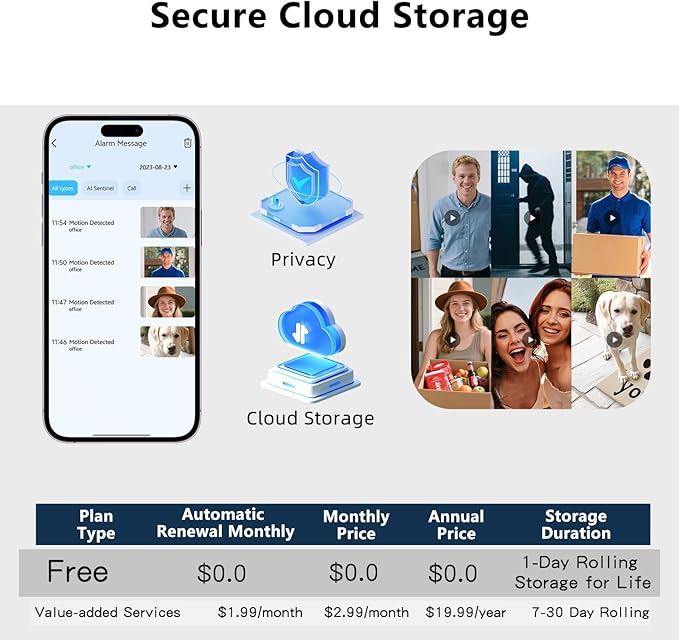 - Secure Cloud Storage & 10000mAh Battery: The weighs up to 500g, the extra weight because of the bigger battery, it includes a built-in up to 10,000mAh large-capacity battery. which ensures up to 180 days of standby and gives the device a more solid, premium feel. Encrypted cloud storage keeps your videos safe even if the device is lost. Lifetime free 1-day rolling storage included, with optional 7/30-day upgrades starting at $1.99/month or $19.99/year.