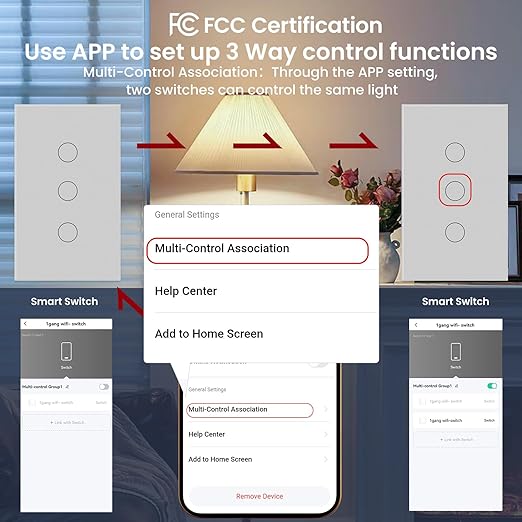 - 【A New 3 Way Control Method】After setting on the APP, three smart light switches can control the same light by touching switch. Setting steps: Select All Devices in the APP, click the corresponding switch, click the upper right corner to enter the new interface, find the Multi-Control Association to set it.This allows you to create a 3-Way circuit(2 switches control 1 light)