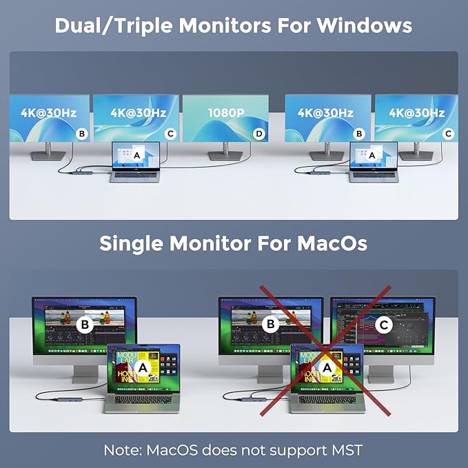 - 【Triple Display Support】 This docking station features 2 USB-C video output ports and 1 HDMI port, enabling dual 4K@30Hz and triple-display output (2×4K@30Hz + 1×1080P). It is ideal for multi-display expansion with DP1.4 laptops. (Note: macOS only supports screen mirroring.)