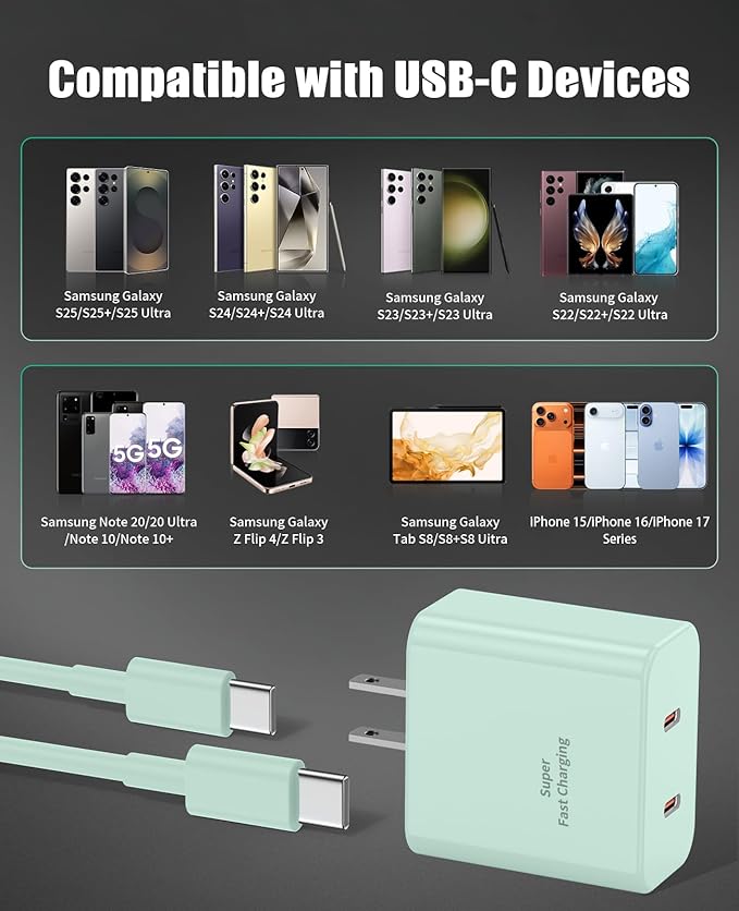 - USB C Wide Compatibility: Not only suitable for various flagship mobile phones and tablets of Samsung, such as Samsung Galaxy S24/S23/S23/S22/S21/S20/S10(Ultra,Plus),Galaxy Tab S9/S8/A9,iPad Pro 13/11/12.9 inch (3/4/5/6th),iPad Air 4/5/6, iPhone 17/16/15 Pro Max, iPhone 17 Air, but also compatible with some other brands of devices that support high-power charging. Whether you are at home, in the office or on the go, you can easily charge your devices to meet your different usage scenario needs