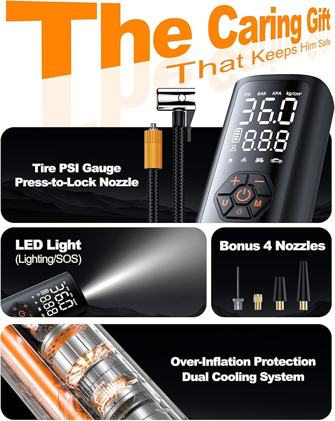 - 【4-in-1 Certified Roadside Guardian】More than just a air inflator, this essential car accessories also functions as a tire pressure gauge for real-time monitoring, a 120LM LED worklight (10hr runtime), and an SOS emergency beacon. FCC/CE/UKCA/UN38.3/RoHS certified, plus premium storage bag – The Christmas Gifts for Men, Dad, Boyfriend.
