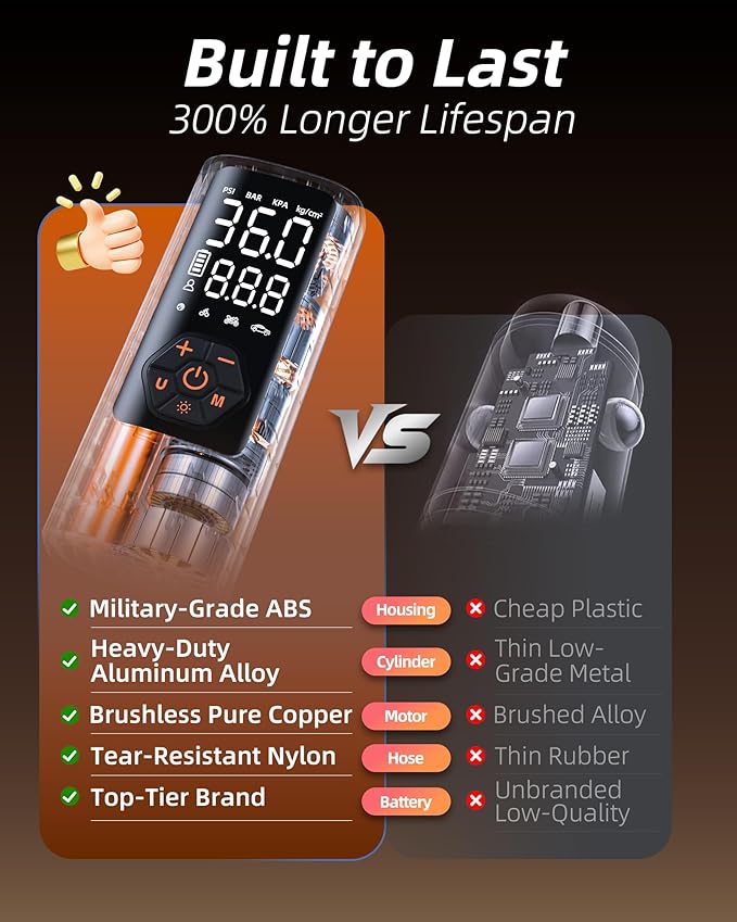 - 【Revolutionary Durability & Premium Build】Shattering flimsy tire pump stereotypes! Our industrial-grade 17mm aluminum cylinder, 76W high-power pure copper motor, military-spec ABS housing, and tear-resistant nylon hose (freeze/explosion-proof) deliver unmatched longevity for the portable air compressor. Unlike disposable bike tire pump, this UN38.3/RoHS-certified air compressor survives extreme road vibrations and -10℃ to 60℃ temperatures. A worthwhile investment battery powered air pump for cars, motorcycle, E-Bike and sports balls (!!!Not recommended for heavy-duty tires, like trucks, pickups, RVs, off-road vehicles)