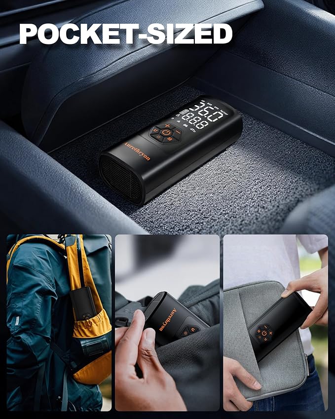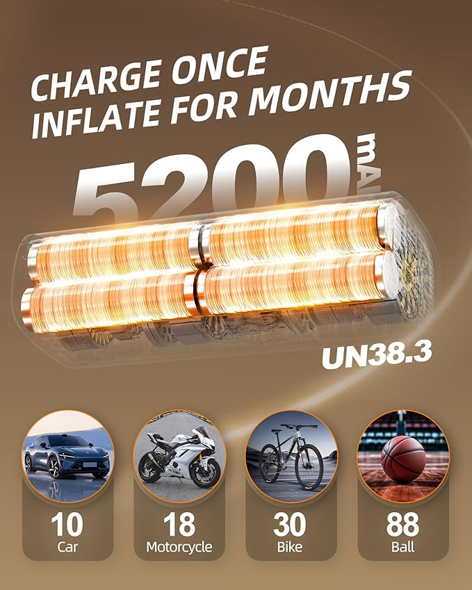 - 【Ultra-Portable Tire Inflator with Gauge】Pocket-sized bike&car tire air pump! At just 1.1 lbs, this rechargeable cordless battery powered air pump fits in glove boxes or bike bags. Its UN38.3-certified 5200mAh battery (Type-C) inflates 10 car tires, 18 motorcycle tires, or 30 bike tires per charge. Overcharge/overheat protection ensures safety during road trips.