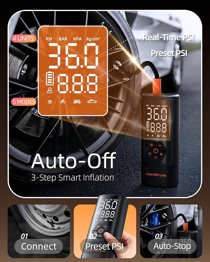 - 【Smart 3-Step Professional Tire Inflator】On the Digital LED screen that monitors and displays real-time pressure values, Select unit (PSI, KPA, BAR, KG/CM²) and Preset the target pressure (5 modes available: Car/Motorcycle/Bike/Ball/Custom) - Connect Nozzle - Auto Off! The cordless air compressor will precisely stop inflating at the target pressure with an accuracy of ±0.1 PSI. This digital tire pressure gauge with inflator makes inflation foolproof for all drivers and cyclists.