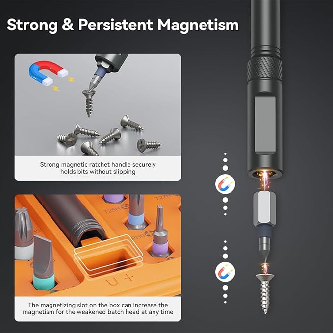 - 【UNMATCHED VERSATILITY IN TIGHT SPACES】Master confined areas with the flexible, detachable ergonomic handle and 6 long-shank + 32 short-shank S2 steel bits (40-in-1 total). The magnetic system securely connects and adjusts length for optimal reach. Covers all essentials: PH, SL, Torx, Hex, and more, tackling everything from intricate electronics to bulky furniture assembly with precision.