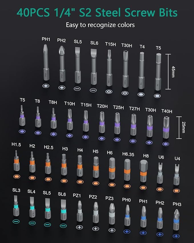 - 40 Color-Coded Magnetic Bits: Contains 40pcs 6.35 mm (1/4 inch) S2 steel magnetic bits, color-coded for easy organization and quick identification. A built-in magnetizing zone instantly magnetizes the bits for a secure grip. No more searching for magnetizers