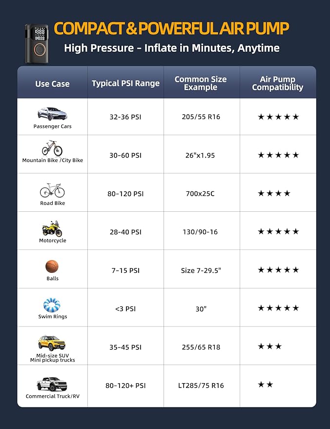 - 【Powerful Performance · 5X Faster Inflation】: Inflate tires in a flash with the Tire Inflator Portable Air Compressor! Featuring a high-performance motor, built-in pressure gauge, and precise sensor, it delivers up to 150 PSI—pumping a 195/65R15 tire from 30 to 36 PSI in just 1 minute, 5X faster than ordinary pumps. Whether you need a reliable tire inflator for your car or a compact bike pump for cycling adventures, it’s perfect for emergencies, road trips, or daily maintenance.
