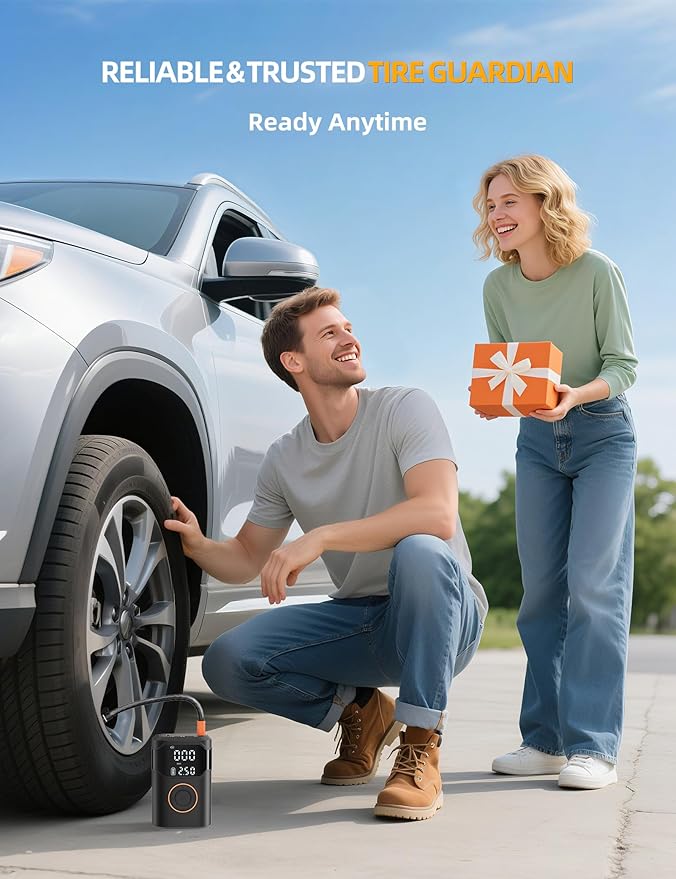 - 【Caring Protection, Perfect Gift】: With this portable car air pump, you can quickly handle unexpected tire issues, giving you and your family peace of mind on every trip. It makes a thoughtful gift for fathers, husbands, boyfriends, brothers, or friends who love cycling and travel—practical, reliable, and full of heart, perfect for Father’s Day, Christmas, and other special occasions.