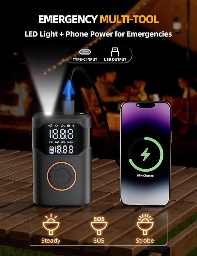 - 【Multi-Function Emergency Tool】: Never waste time driving miles to paid air stations or hunting for a pump again. This portable mini inflator serves as your car tire inflator, bike air pump, e-bike inflator, and works with balls, air mattresses, and other inflatables. Equipped with a USB output, it can also power your phone or other devices in emergencies. Built-in LED flashlight with steady, strobe, and SOS modes ensures safe and convenient use anytime—even at night.