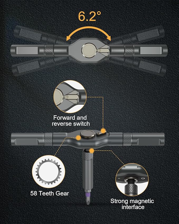 - Precision Ratchet Mechanism: This DIY screwdriver set features a precision ratchet design, delivering a powerful torque of 50N.m, while reducing required effort by 80%. It eliminates the need for wrist adjustments, making it ideal for prolonged use or working effortlessly in confined spaces