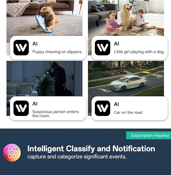 - 【Scenario AI Smart Classification & Search】: Our cámara de interior able to automatically identifies and categorizes the recorded videos into people, vehicles, pets, and alarms for easy search and playback according to keywards and date. Focus on key events, a straight-to-the-point notification, and act faster on alerts.ps:categorizes function require subscribed.
