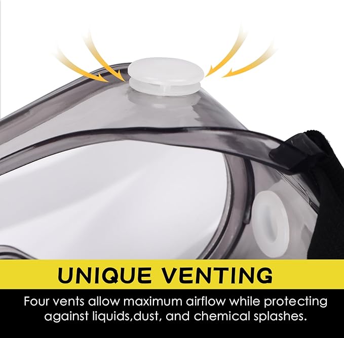 - Anti Fog and Ventilated: the lenses of eye protection goggles provide a clear and transparent visual effect, no dead angle, wide field of vision; 4 Vents allow maximum airflow while protecting eyes against liquids, some airborne particulates and dust