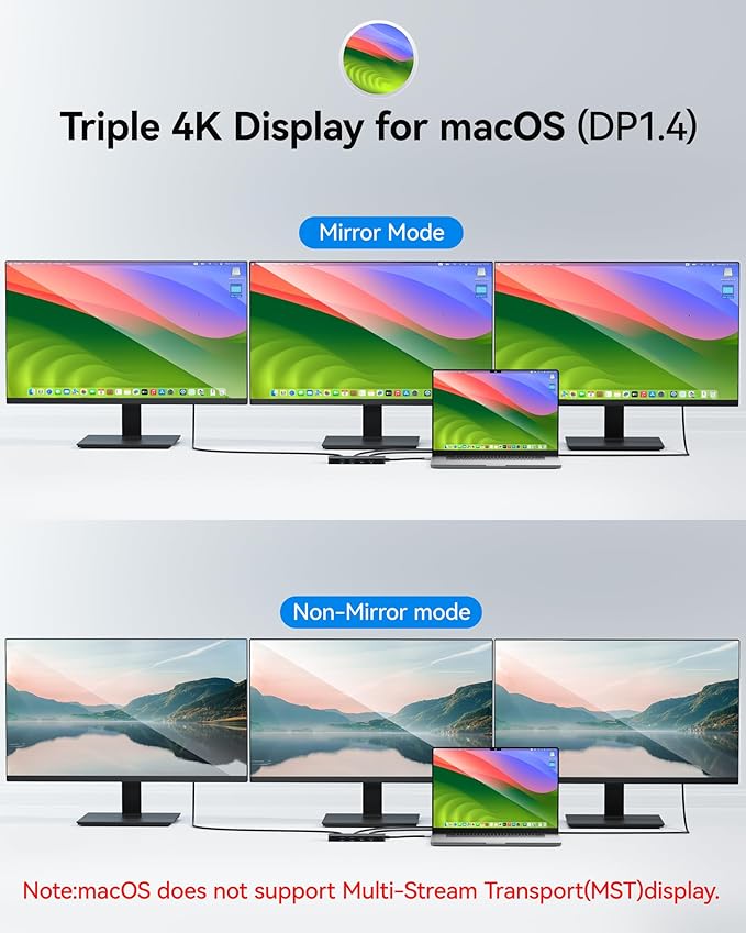 - Enhanced 4K Triple Display: The Dual Monitor Docking Station seamlessly enables dual and triple monitor setups for Windows OS, allowing you to efficiently manage different tasks across multiple screens, thereby boosting your productivity and enhancing both work and personal life. Please note: On macOS systems, the second external monitor will only mirror (duplicate) the first external monitor, rather than extending the desktop to create additional workspace