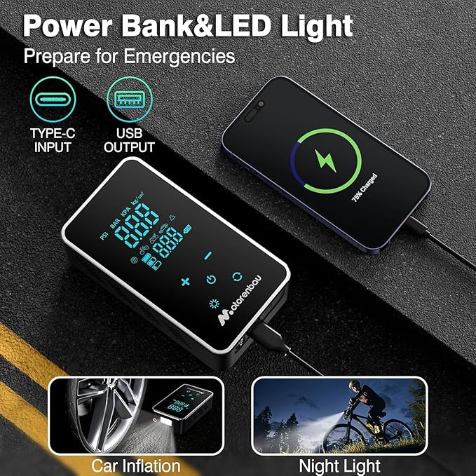 - 【Long-Lasting Battery & Emergency Flashlight】This tire air pump features a built-in 4000mAh rechargeable battery and USB-C and USB input/output ports, providing backup power for your phone and other electronic devices. It also features 3 light modes (flashlight, SOS, and strobe) for added safety on the go.