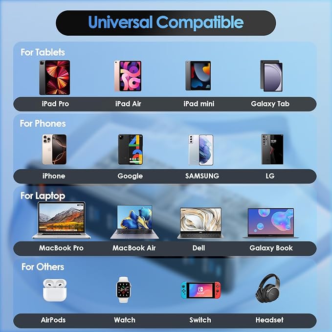 - Compatible Devices : Compatible with Smartphone, Tablet, and Laptop, such as MacBook Pro 13''/ MacBook Pro 15''/ MacBook Pro 16"/ MacBook Air 13''/ MacBook 12''; iPhone 15/14 14plus 14 pro max 13/ 13 Mini/ 13 Pro/ 13 Pro Max, iPhone 12/ 12 Mini/ 12 Pro/ 12 Pro Max/ XS/ XS Max/ XR/ X/ 11/ 11 Pro/ 11 Pro Max/ iPhone SE 2020/ 8 Plus/ 8; Samsung Galaxy S21+/ S21/ S21 Ultra/ S21 FE/ S20+/ S20/ S10/ S10e/ S10+/ S9/ S9+/ S8/ S8+/ Note 20/ Note 9/ Note 8/ Z Flip/ Z Fold; Dell XPS 15/ 13; Google Pixel 5/ Pixel 4a/ 4 XL/ 4/ Pixel 3a/ 3a XL/ 3 XL/ 2 XL /2; iPad Pro 12.9''/ iPad Pro 10.5''/ iPad Pro 11''/ iPad Mini Series/ iPad Air Series; AirPods Pro, Nintendo Switch; LG G7/ V30+; Nexus 5X/ 6P, Sony XZ2 Premium, Sony XZ3, and more Compatible with Smartphone, Tablet, and Laptop, such as MacBook Pro 13''/ MacBook Pro 15''/ MacBook Pro 16"/ MacBook Air 13''/ MacBook 12''; iPhone 15/14 14plus 14 pro max 13/ 13 Mini/ 13 Pro/ 13 Pro Max, iPhone 12/ 12 Mi… See more