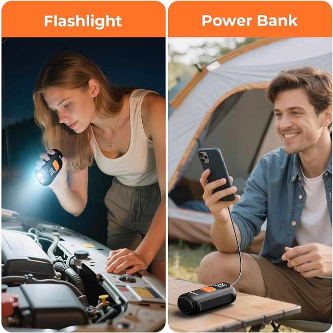 - [VERSATILE EMERGENCY TOOL] In addition to inflating tires, the air pump for car tires features a flashlight with three modes of illumination, alarm, and SOS - perfect for nighttime repairs or camping.he simple and intuitive button layout makes it easy to operate with precision, even in the dark. Whether your car breaks down on a rainy night or your phone runs out of battery during a road trip, this air pump for inflatable got you covered when you need it