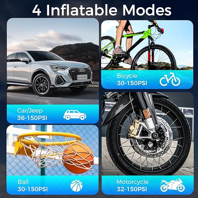 - 【Accurate LED Display and Automatic Stop】This tire inflator comes with a high-precision pressure sensor and an LED display for effortless monitoring and operation. It automatically shuts off when the tire hits the preset pressure, preventing over-inflation. You can choose 4+N smart modes (car, motorcycle, bicycle, ball, and custom) and switching 4 units(PSI, BAR, KPA,KG/CM).