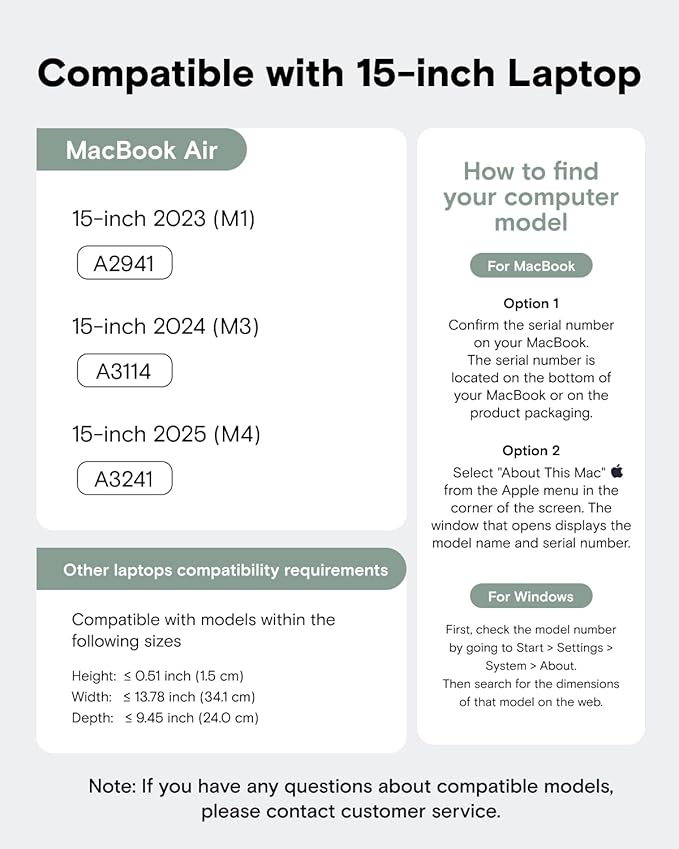 - Compatibility: Designed for 15 inch laptops. Laptop sleeve dimensions: 14.65 x 9.9 inch, Maximum compatible size: 13.78 x 9.45 x 0.51 inch. Laptop sleeve Precisely fits MacBook Air 15-in.(M2/M3/M4, 2023-2025)