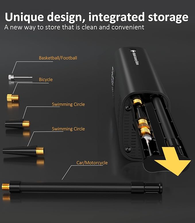 - Functionality Updates:The air compressor comes with a variety of adapters for a wide range of applications, suitable for large trucks, cars, bicycles, basketballs, swimming laps and so on. The portable air compressor adopts the latest internal storage method, which abandons the traditional storage method, is more convenient and quicker, and also prevents the accessories from being lost.