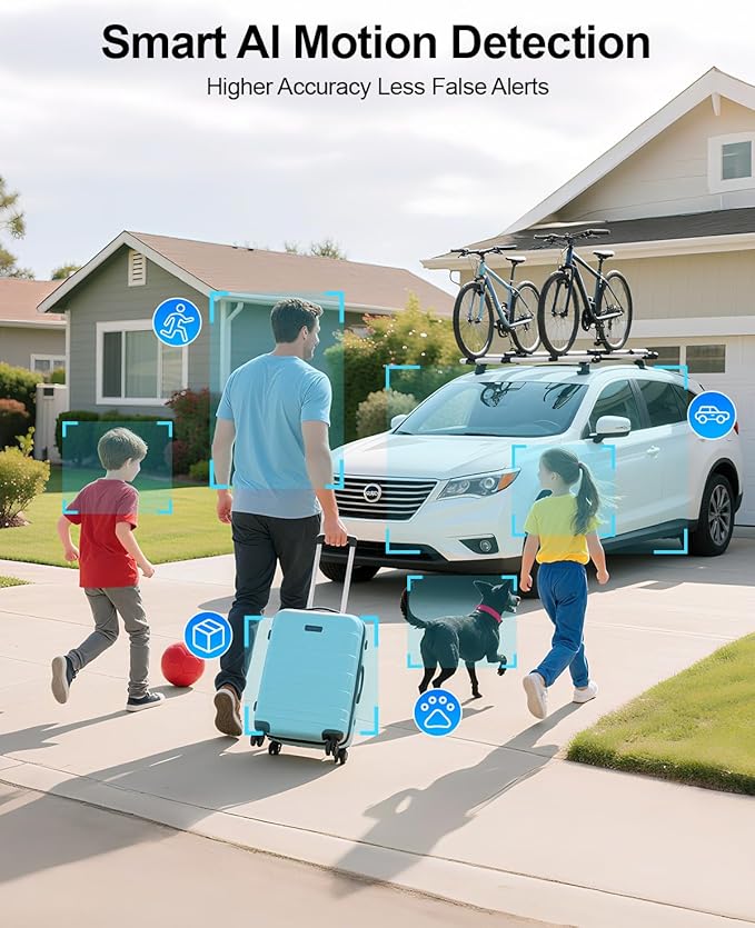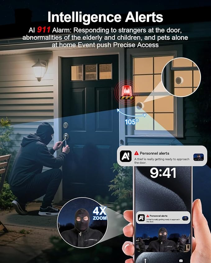 - AI Motion Detection & 911 Alarm: The window camera uses advanced AI recognition technology to accurately detect human, pets, vehicles and various abnormal events (such as elderly falling, fire, children crying, etc.). Once an emergency is detected, it will auto share your location, send real-time messages and videos, and you can remotely dial 911 to keep your home safe