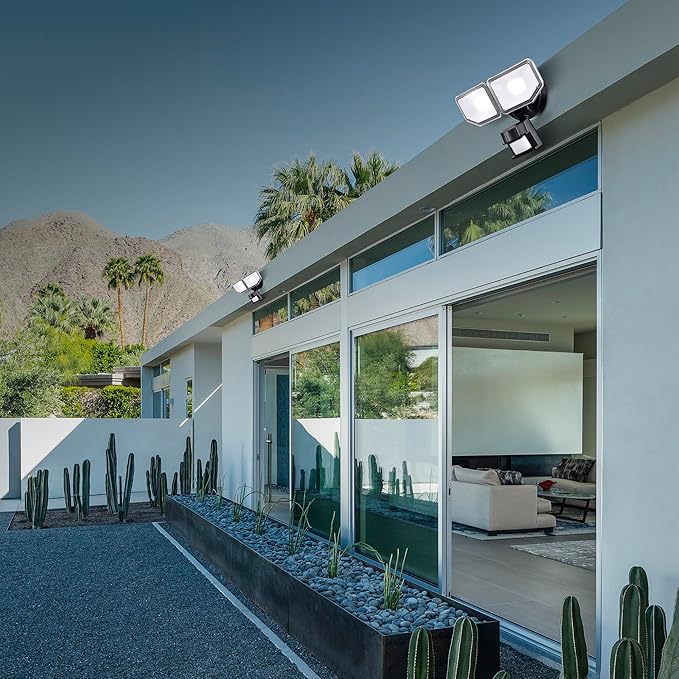- ENERGY STAR CERTIFIED: Very bright LED outdoor motion sensor security light at 4000 Lumens output by 2 energy saving light heads, 40 watts in total. Provides excellent lighting for the exterior of your home while saving over 75% on your electricity bill on energy costs. Upgraded clear shades allow for a brighter light output to securely cover all areas that may need extra security.